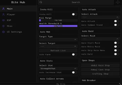 Awaken one of many unique Stands in Bizarre Lineage, each with its own moveset, playstyle, and power, inspired by the anime JoJo. Battle alongside others to bring down powerful raid bosses and push your limits. With kill autofarm, auto farm mobs, auto raid, and more, your journey to master your Stand and dominate every encounter is fully automated and unstoppable.