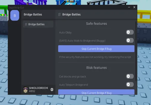 Features: Auto Walk to Bridge end, Auto Obby, Teleport to the end of the bridge, Teleport to blocks and back to original position