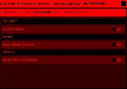 Functions: Auto collect, Auto Wake tyrone, Auto Turn on Power, Player walkspeed modifier & more