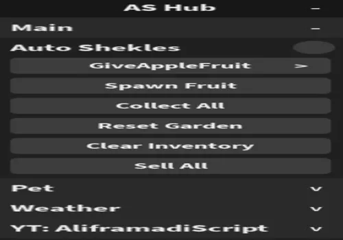 Functions: Auto Shekles, Give apple fruit, Spawn fruit, Collect all, Reset garden, Sell all