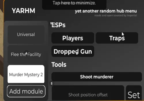 ESP players, ESP traps, Shoot murderer, Aimbot, Godmode, Teleport, Kill all
