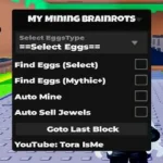 My Mining Brainrots script with Find Any Eggs, Auto Mine, and TP to Last Block to hatch exotic Brainrots and upgrade your base. Works on mobile: Arceus X, Delta X, Solara