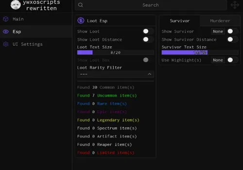- ESP: Loot, Survivor, Murderer – Highlights all key entities through walls.