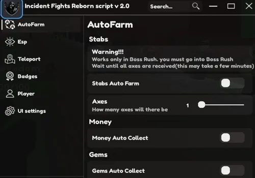 Functions: Stabs autofarm, Money AutoCollect, Gems Auto Collect, Instant mob killing, Money ESP, Gems ESP, Teleports, Anti AFK